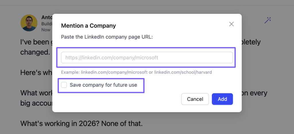 Don’t see it? No problem. Just select “Mention other company” and paste the company’s LinkedIn URL. That’s it.
